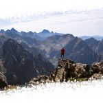 Am nächsten Morgen hat es aufgehört zu regnen, allerdings ist es komplett vernebelt. Wir laufen mit der Erwartung los, dass wir den Rest des Tages nicht mehr viel von den Bergen um uns herum sehen werden. Wir gehen im Nebel am Grat entlang, wir haben noch einmal ein paar Höhenmeter vor uns. Und dann passiert, was wir nicht erwartet haben: Der Nebel lichtet sich, je höher wir kommen, und wir sehen einen der schönsten Sonnenaufgänge unserer gesamten Tour.